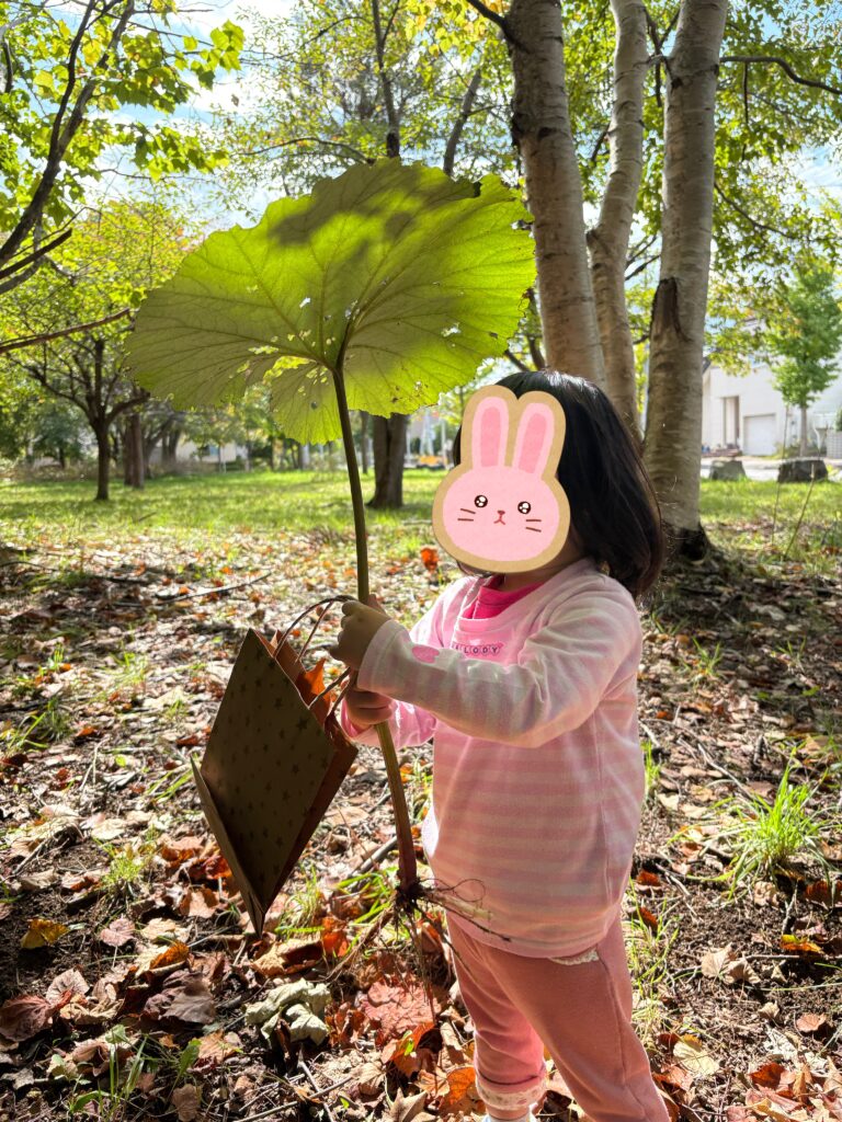 大きなフキの葉っぱを見つけて傘のように持って楽しんでいましたよ(^^)