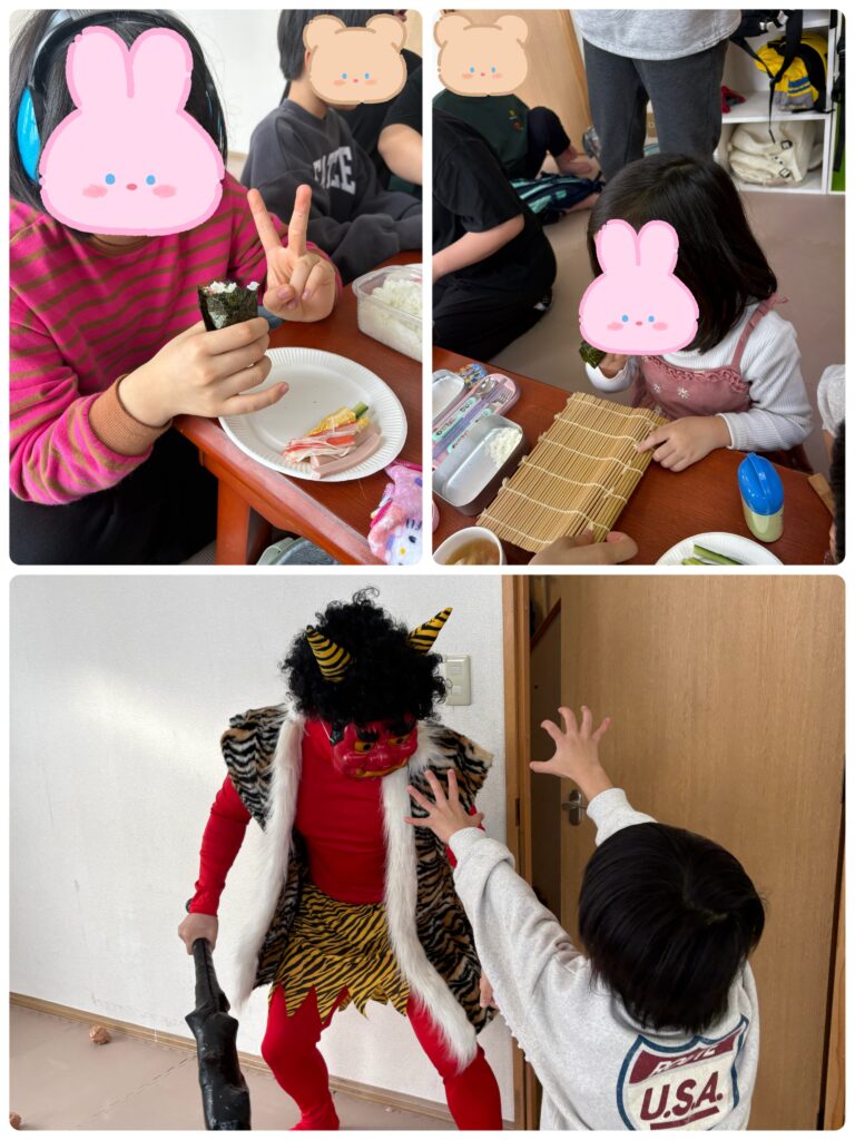 ゲームや節分についてのお話しを聞いたり、恵方巻を作って食べました(^^)